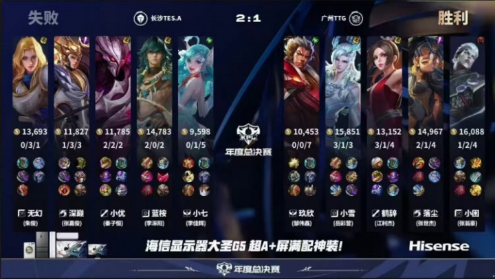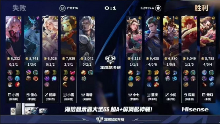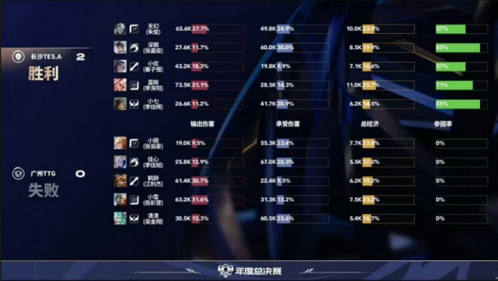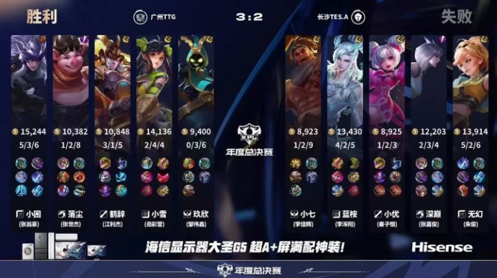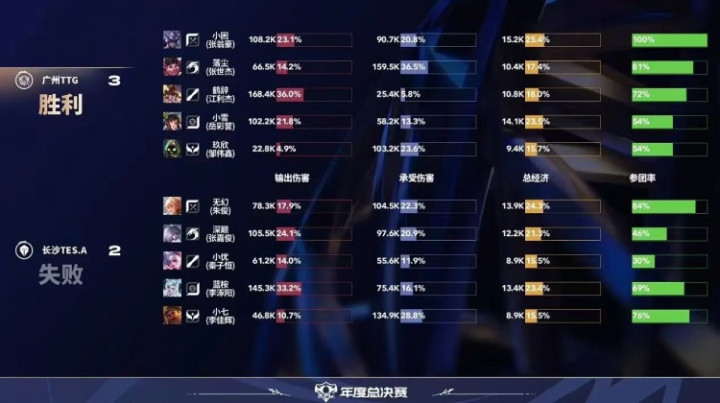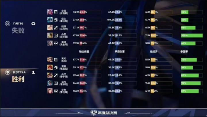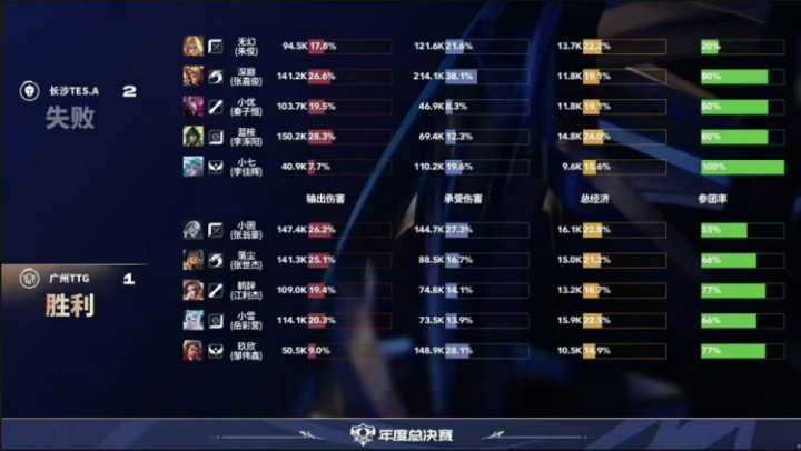 直播吧10月3日讯2025KPL年度总决赛本场比赛是由广州TTG对阵到长沙TES.A!第一局:TES前期不断抓TTG掉点入侵压制打出经济优势,后期TES针对鲁班成功打赢团战拿下首局胜利!第二局:阿离前期拿下一血后成功滚出节奏,TES凭借阿离发挥成功快速终结比赛先拿赛点!第三局:TES前期打出优势节奏,但是中期TTG凭借配合成功将局势稳住,20分钟TTG抓到掉点后成功拿下一分!第四局:TTG凭借夏洛特的发挥成功打出压制,夏洛特单带牵扯TES成功帮助TTG扳平比分!第五局:前期TES打出优势但是主宰团TES团战失利被TTG完成翻盘,TTG成功拿下胜利!