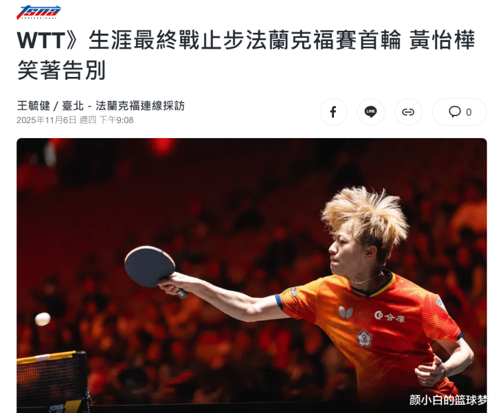 北京时间11月6日晚,台媒报道,黄怡桦WTT生涯最终战止步法兰克福首轮,黄怡桦笑着告别。
