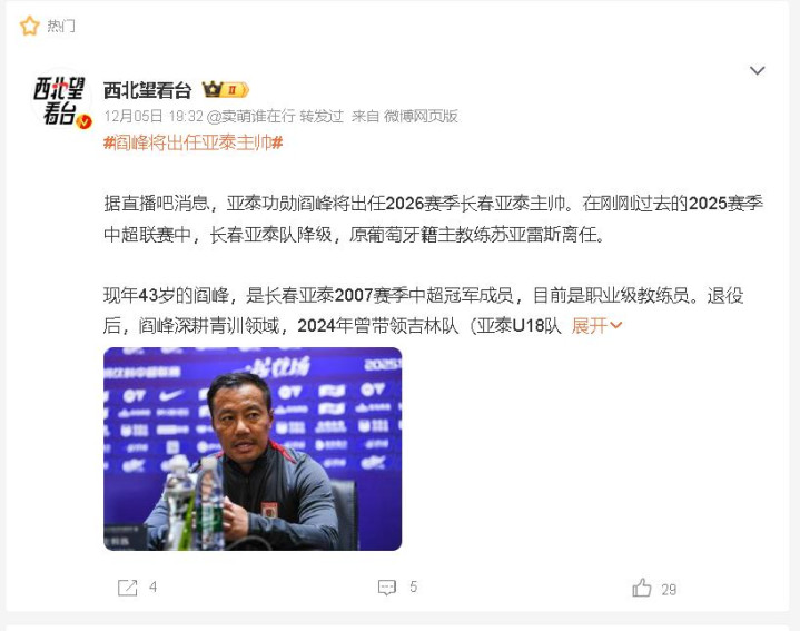 一个熟悉的人名字现在大家的视野,他就是阎峰,据直播吧消息透露,他将出任球队主教练,带领长春亚泰征战中甲,他今年43岁,也是长春亚泰2007赛季中超冠军成员,目前是职业级教练员,退役后,他一直深耕青训,在这个领域颇有知名度,2024年带领吉林队,原亚泰U18队斩获全国青少年三大球运动会男足第三名,新赛季正是是以老将和小将相结合,可以发挥他的优势,培养更多有实力的年轻球员。
