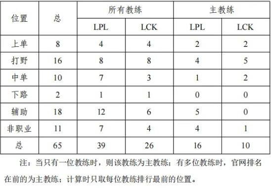 LPL辅助选手转教练的最多,LCK则是打野选手转的最多。