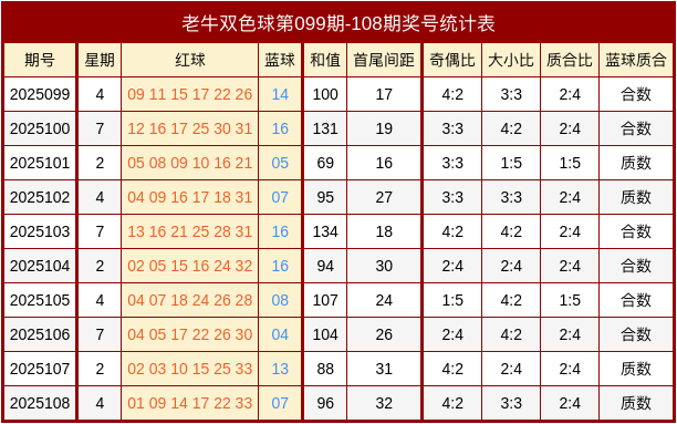 上期回顾:双色球2025108期开出奖号:红球01、09、14、17、22、33,蓝球07。