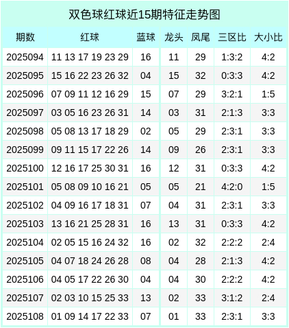 上期回顾:双色球第2025108期回顾:红球01、09、14、17、22、33 + 蓝球07。