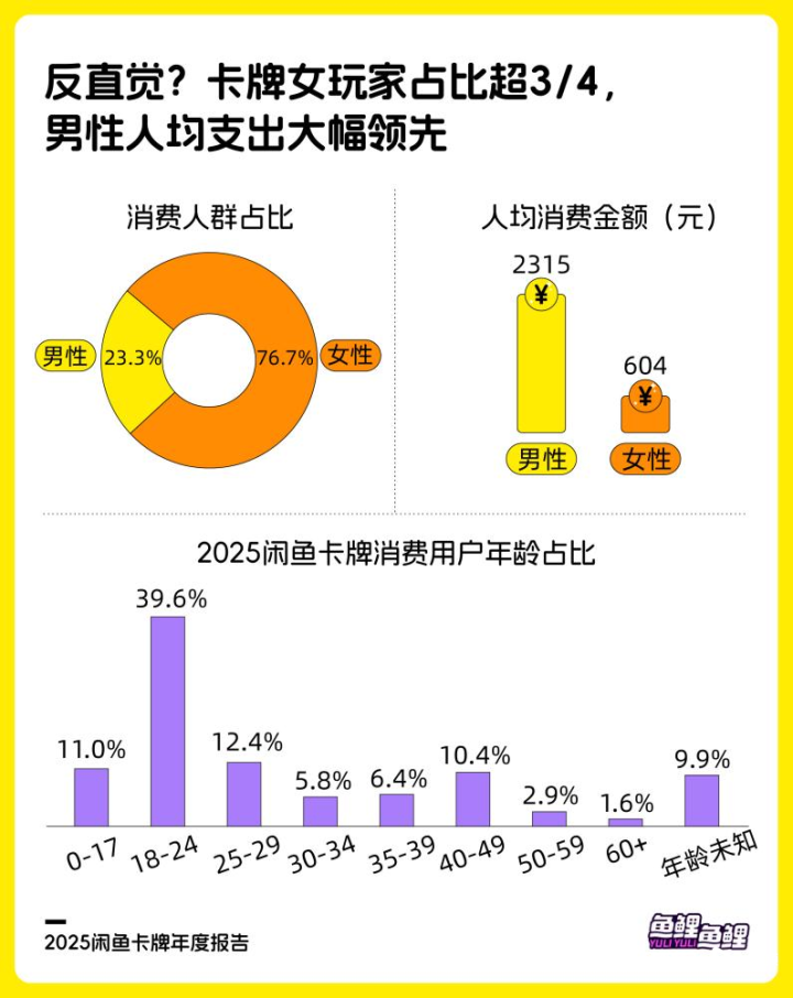 报告还调研了卡牌消费群体,发现2025年超过四分之三的卡牌消费者为女性,构成用户主力。尽管女性用户占绝对多数,男性的消费力却更为强劲,年度人均卡牌支出是女性的3.8倍。从消费人群年龄来看,52%的卡牌玩家为18至29岁的成年人,且各年龄段均有分布。