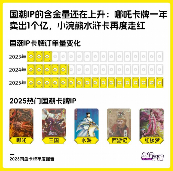 国产动画、剧集等接连大火,国潮IP的“含金量”还在上升。今年闲鱼平台国潮IP卡牌交易量飙升332%,其中哪吒卡牌断层领先,年度交易额超过1亿元,水浒、三国等经典名著卡牌热度大幅提升,水浒卡交易额涨超122%。