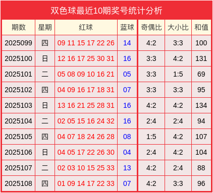 开奖回顾:福彩双色球第2025108期奖号为:01、09、14、17、22、33+07。奇偶比为4:2,大小比为3:3。和值为96。